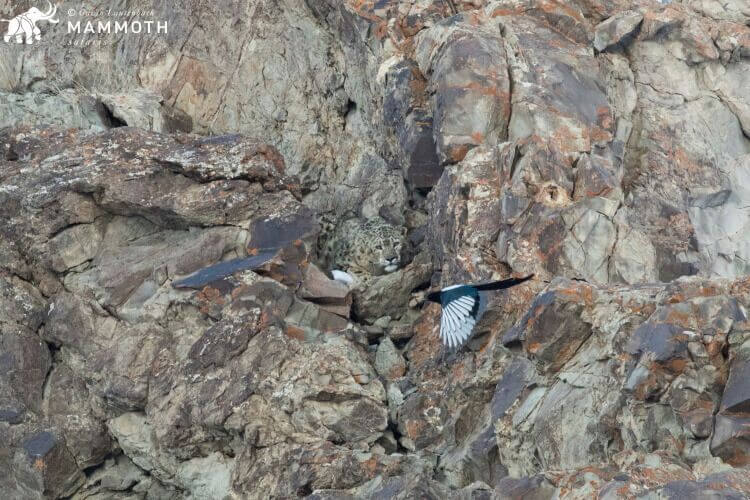 Here a magpie flies past the ever alert cat. Action in these stark conditions comes not only from the elusive snow leopard.
