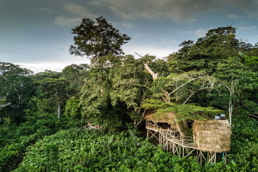 Ngaga Camp is in the Ndzehi Forest on the western boundary of Odzala-Kokoua National Park and consists of 6 rooms beautifully constructed from natural materials such as locally woven raffia palm panels. The rooms are raised on 3 – 4 meter stilts and have 360° wraparound viewing walkways that connect with the main area. The camp has a dining room, lounge, and bar area all on raised decks looking out into the rainforest. Pre-dinner drinks are served on the “star deck” with fire pit which is a dropped deck below the main area. Guests can enjoy post forest walk drinks, cocktail parties or private dinners on the river deck which is located on the Ngaga stream.