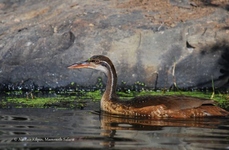 But for those that know Kwandwe, you’ll be asking me about all the other things we saw, for this is what really makes this place a special wildlife destination. No shortage I can tell you. The Aardwolf were out in the day whilst Elephant Shrews and Karoo Rats were there for the beady-eyed as they sunned themselves in the early morning. Bat-eared Foxes lazed near their den; Black-backed Jackals were as busy as ever and added the vocal accompaniment when the lions weren’t roaring! Seeing 3 Cape Clawless Otters feasting on crabs in the orange sunset glow is also right up there in terms of special sightings. There were mongooses, meerkats and porcupines (yes, in the daylight too) and I haven’t even started with the birds. Ok, I’ll do the birds: Lanner Falcons hunting rodents, a young Pale Chanting Goshawk mobbing the enormous Martial Eagle, Knysna Woodpecker, Crowned Hornbill flocks and the endangered Kori and Ludwig’s Bustards which roamed the flats. The waterbodies were also packed as the landscape dries out a little in winter – honking South African Shelduck, Little Grebes, dainty White-backed Duck, 5 species of Kingfisher and the highlight of my best ever African Finfoot sighting. I’ll leave the wonderfully rich botanical side for another day. And then because of all the large animals piling up their dung, there are dung beetles and because of that there are Mammoth Wasps – indeed – our namesake is even in the insect book – a big lifer for me!