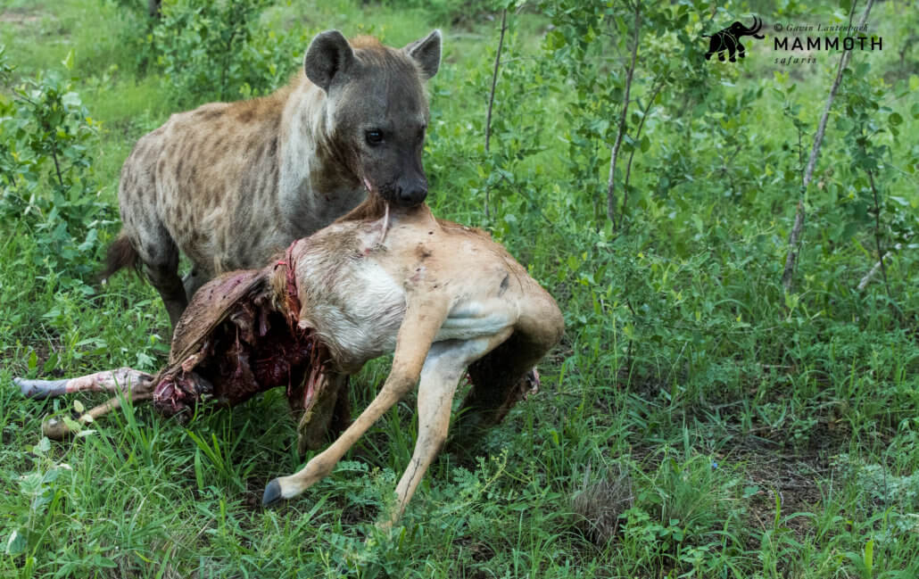 It is not often that a Spotted Hyena will be presented with a virtually intact carcass like this Impala stolen off a Leopard, as African Wild Dogs do tend to “decimate” their prey in very quick time. That said though, the much bigger, stronger and more powerful Hyena do represent a threat to African Wild Dogs. They will not only steal food off the dogs when given the opportunity, but will also seek out and kill the pups. Much like the large prides of Lion putting pressure on the dogs, large clans of Hyena in a particular area will also “encourage” the dogs to set up shop elsewhere. When all the 5 “big” predators are in a particular area, Lion and Hyena will typically vie for top spot on the predator hierarchy (Lion pride vs Hyena clan size determining who takes gold) with the Leopard usually gracing third spot on this list. The Wild Dog will then follow in fourth, with the Cheetah – risking none of its speed and grace in any injury-causing conflict – languishing at the bottom.