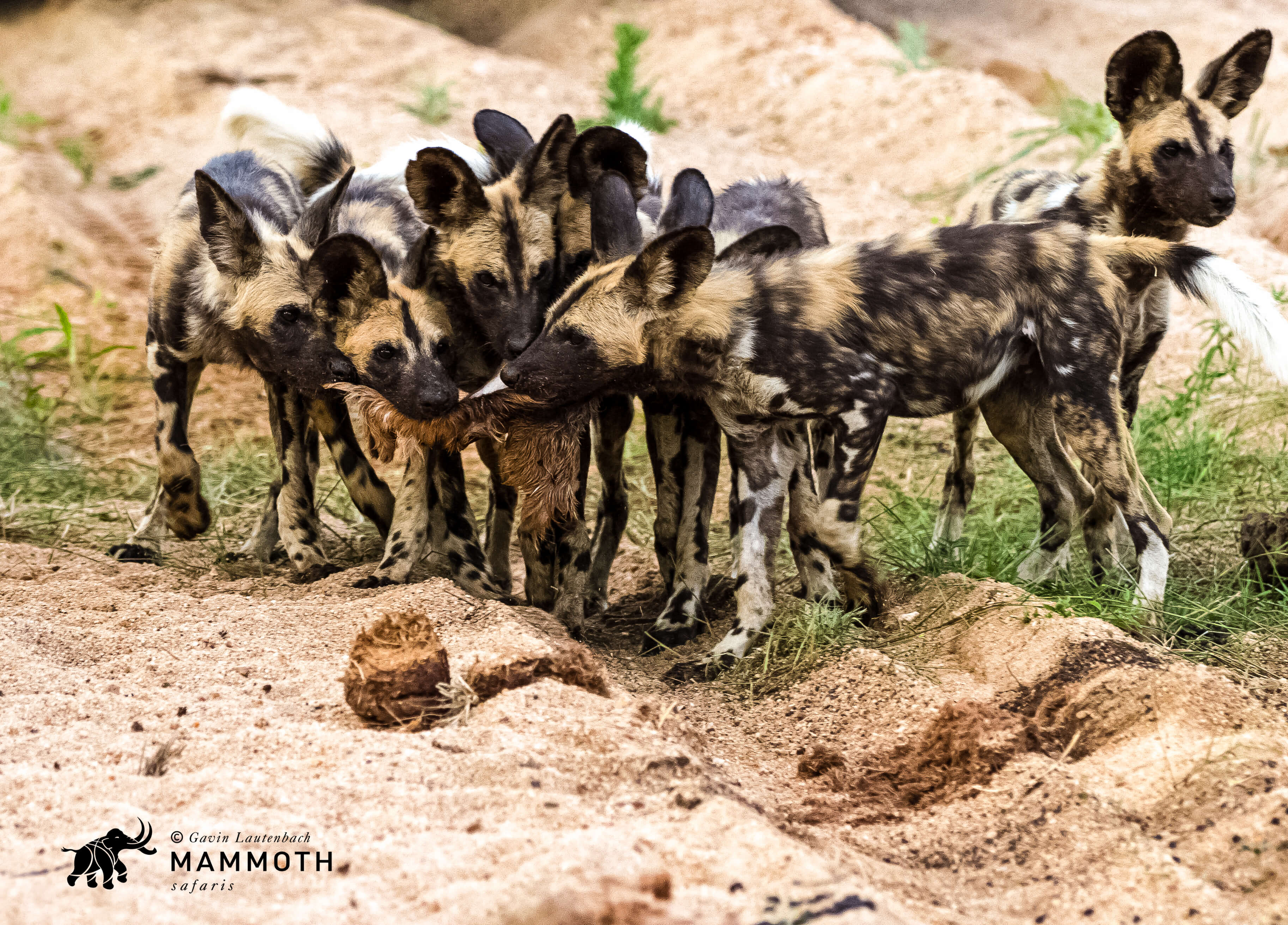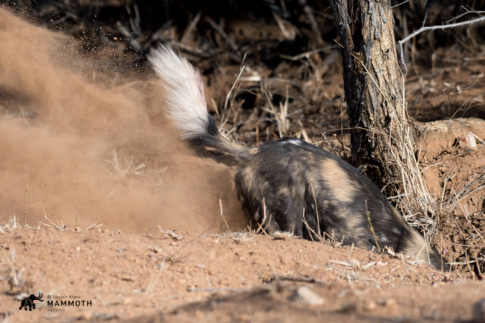 The African Wild Dog will create a den in which to give birth to and raise the pups in. This home is typically dug into large termite mounds, often making use of abandoned warthog burrows, or further excavating holes dug by aardvarks. Once a den is established the pack will base themselves around that site until the pups are old enough to move with the adults, typically for at least 3 months. The discovery of a den is striking safari gold, and a number of reserve areas are fortunate enough to have fairly consistent and predictable (as much as anything is consistent and predictable in the African wilderness) den site offerings. Predator pressure will see the dogs move home very swiftly, and Monday’s home can quickly become Tuesday’s hole in the ground.