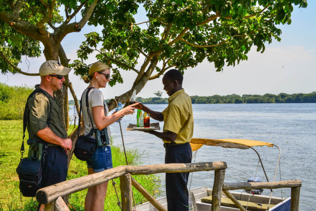 Gavin and Katlyn enjoying a drink on the southern bank of the mighty Nile River that transects Murchison Falls National Park. The intimate and upmarket Wild Frontiers Baker’s Safari Lodge is set on the water’s edge overlooks a clearing, large shady trees and wetland areas abundant in bird life and an ideal place to find an illusive Shoebill. The MFNP is a wonderful destination – enjoy the falls on the Victoria Nile and some decent game viewing here too