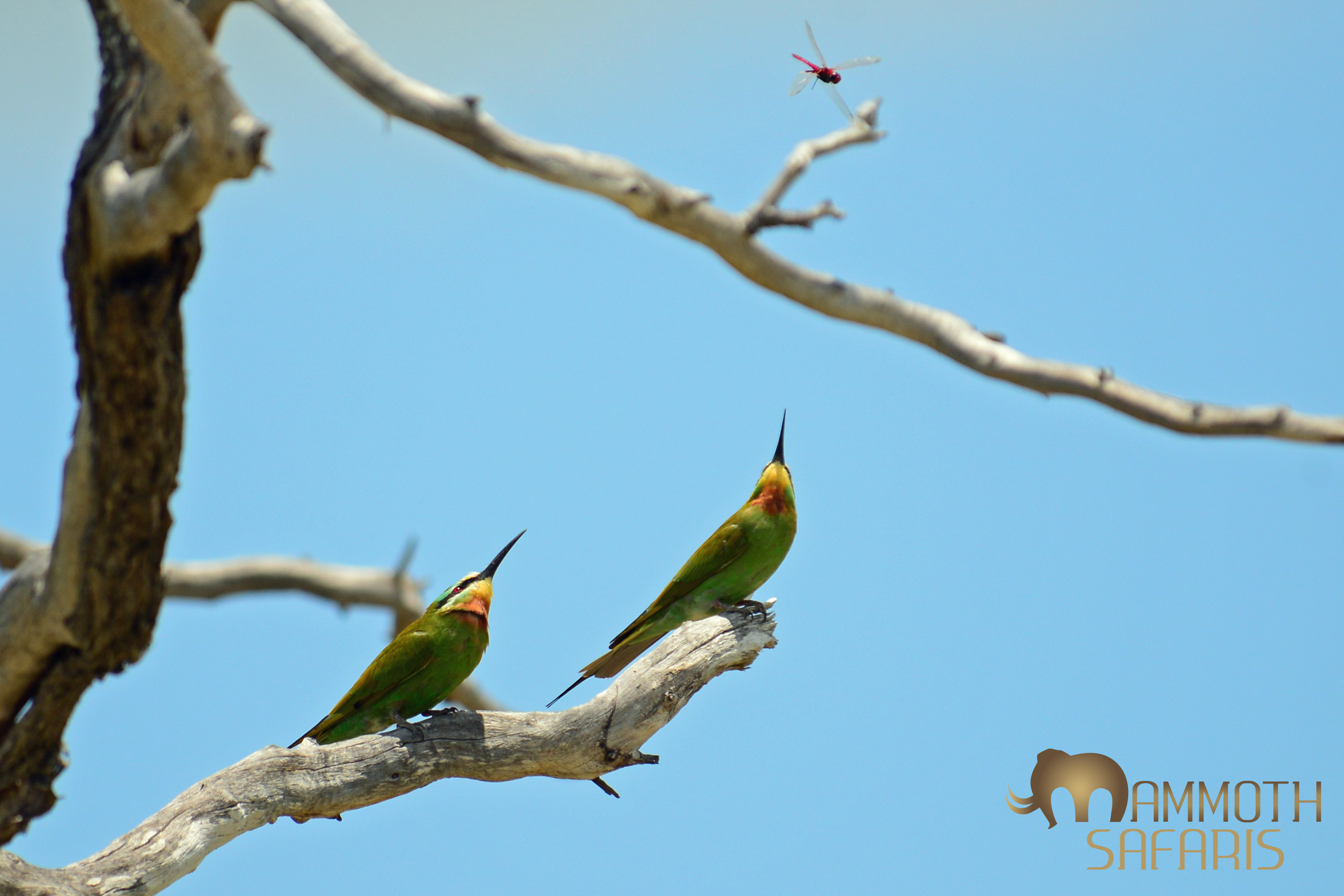 This was a lucky escape for the dragonfly that flew right past a tree loaded with Blue-cheeked Bee-eaters – this is like running past a family of bears whilst covered in honey!